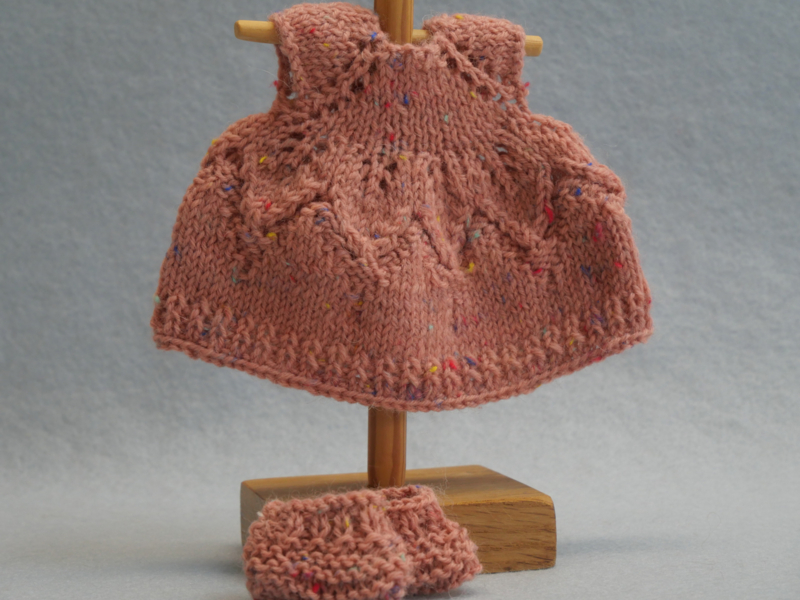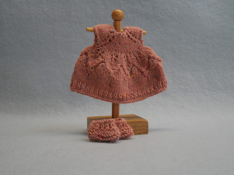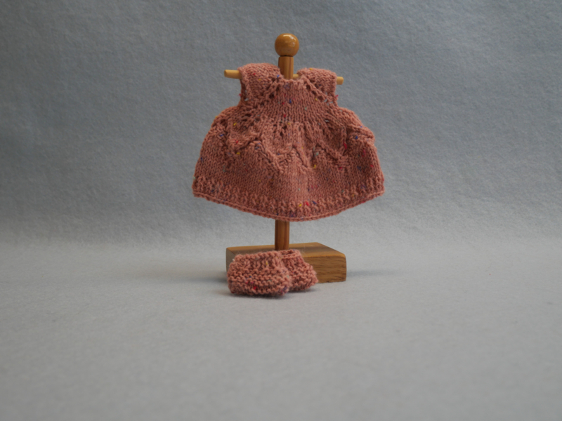 Het jurkje is gebreid van Durable Soqs tweed Vintage pink.
