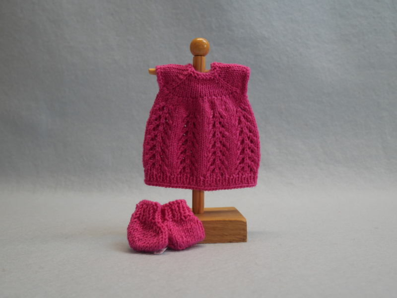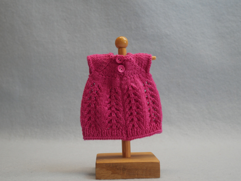 Het jurkje is gebreid met een ajourpatroon in de rok. De kleur is fel roze