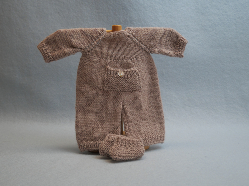De broekpak en slofjes zijn gebreid van GB sprint woll grijs/bruin.