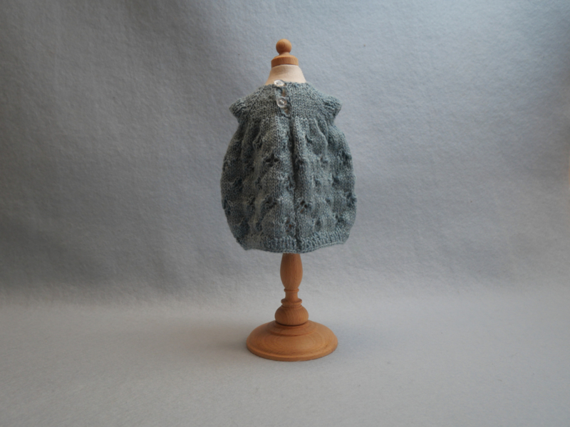 OverzichtJurkje en slofjes geschikt voor Bloesem en andere 30cm popjes. De rok van de jurk is gebreid in met een gaatjes patroon.
