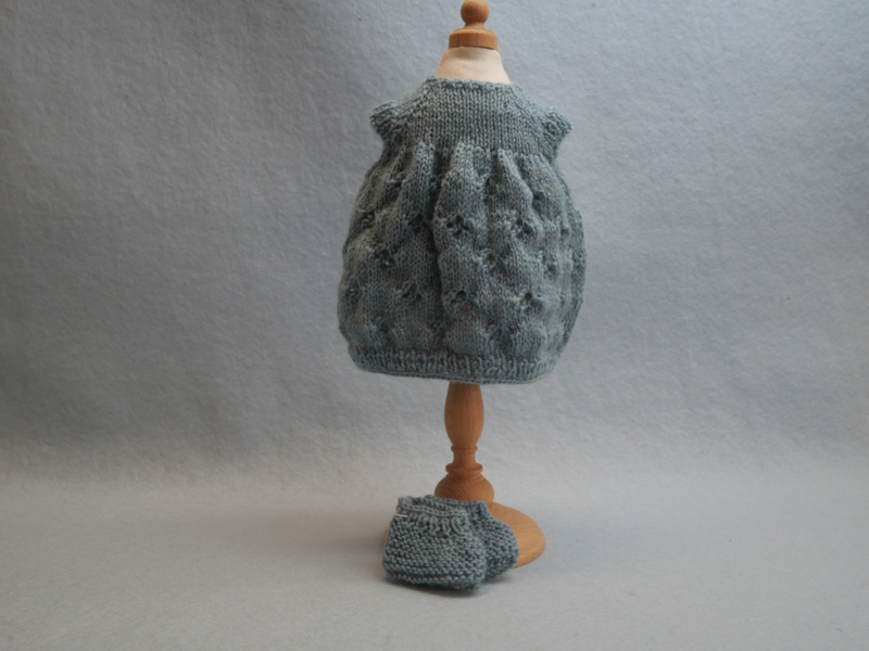 Jurkje en slofjes geschikt voor Bloesem en andere 30cm popjes. De rok van de jurk is gebreid in met een gaatjes patroon.