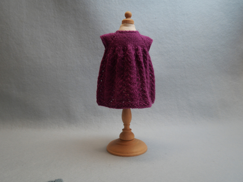 OverzichtJurkje, vestje en slofjes geschikt voor Bloesem en andere 30cm popjes. De rok van de jurk is gebreid met een ajour steek.