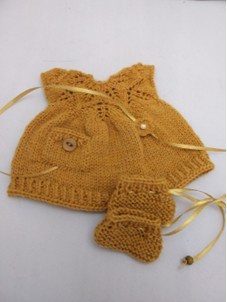 Artikelnummer: 30-014 OverzichtDit is een patroon van een gebreid Jurkje met bladmotief en slofjes .